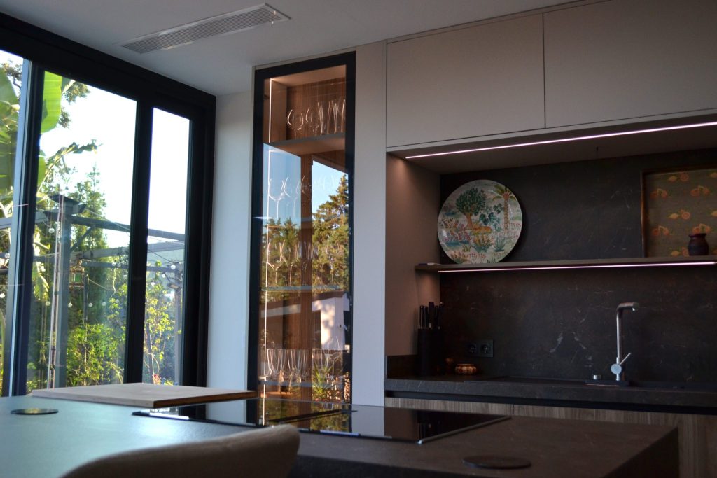 La iluminación en vitrinas aporta profundidad, elegancia y una sensación de cocina premium, resaltando la cristalería y la vajilla como parte del diseño.