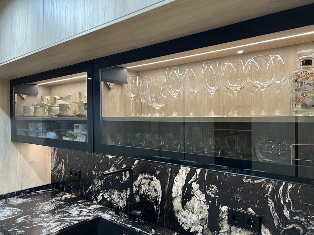 Otro de los elementos que hemos incorporado en estos proyectos es la iluminación interior en vitrinas, tanto en los espacios destinados a copas como en los módulos para vajilla.